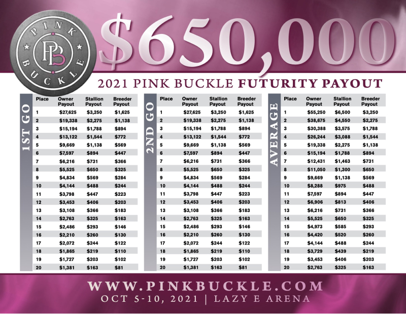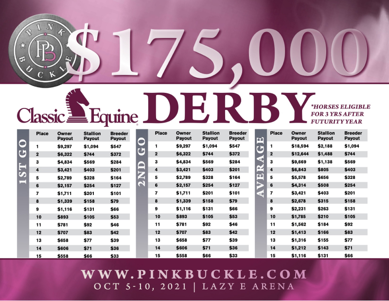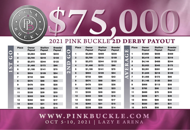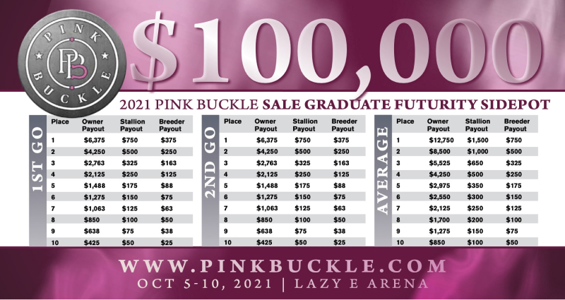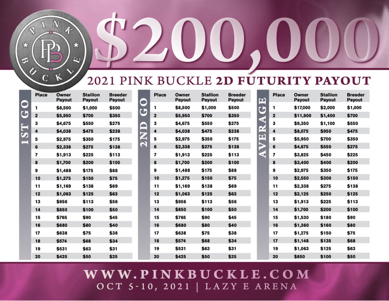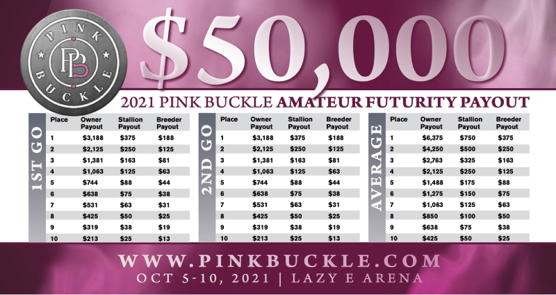 * To run at the Pink Buckle Barrel Race Open 4D & Futurity at the Lazy E Arena, Guthrie, OK – $200 Nomination Fee must be rec’d prior to entering.